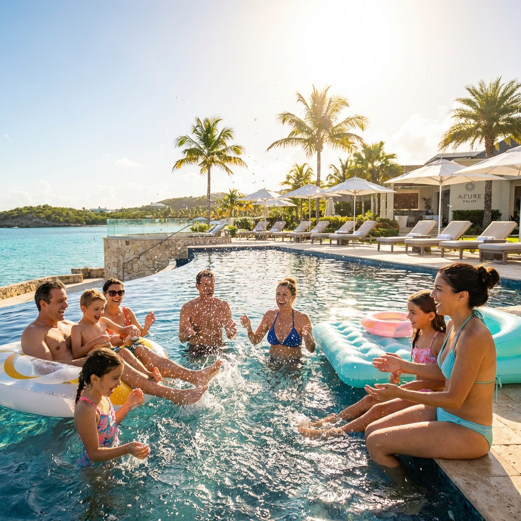 야자수가 둘러싼 럭셔리 인피니티 풀에서 가족들이 물놀이를 하며 물보라를 일으키고 환하게 웃는 여름날의 즐거운 휴가 순간