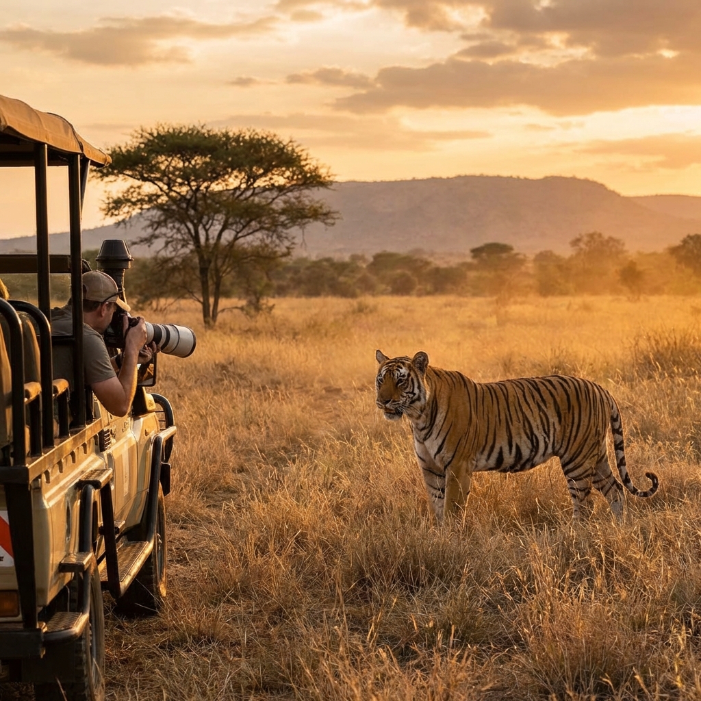 아프리카 사바나의 황금빛 석양 아래, 사파리 지프에서 위풍당당한 벵갈 호랑이와 가까이서 마주하며 카메라에 담는 야생 사진작가의 스릴 넘치는 순간